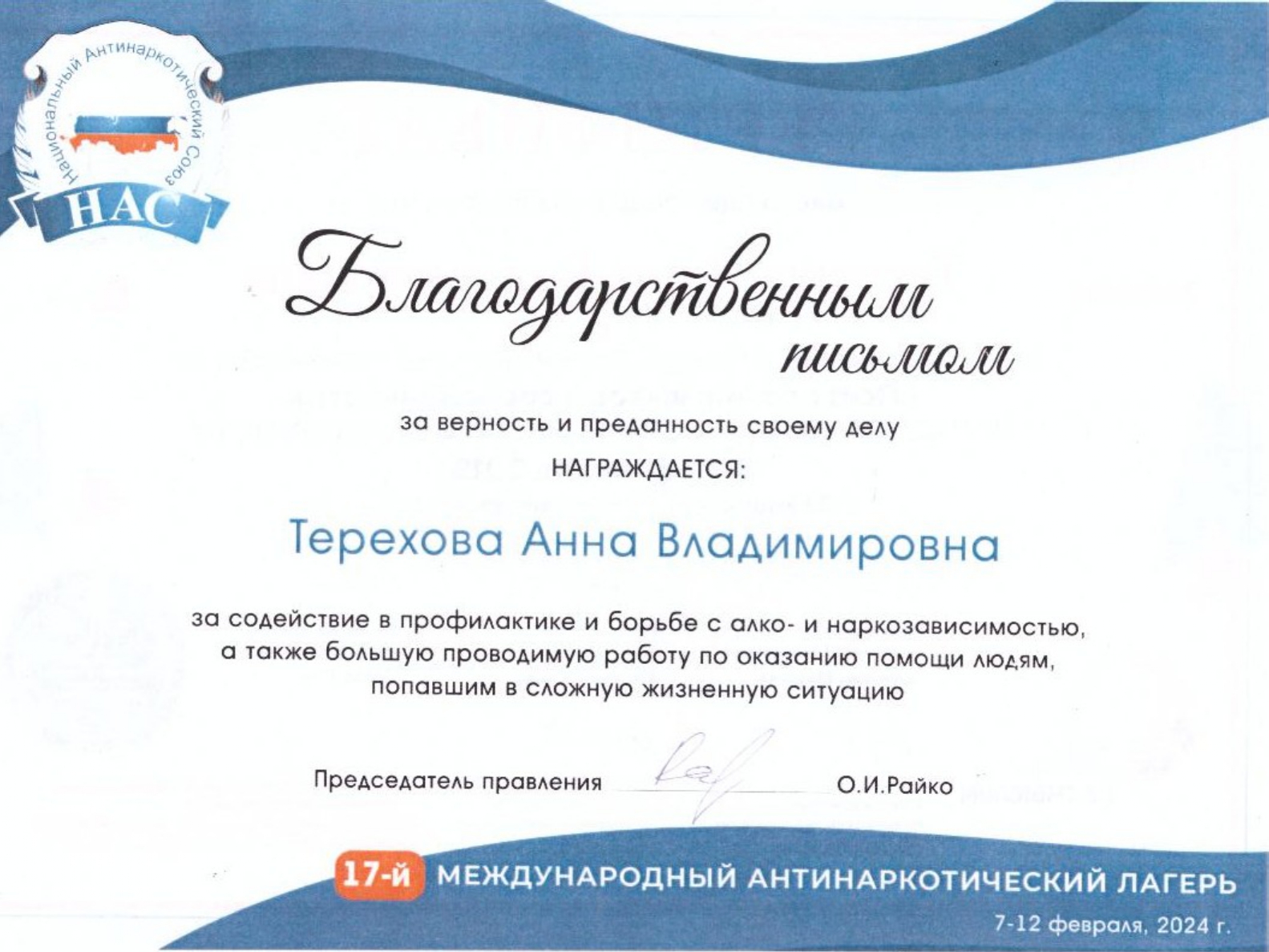 Благодарю Анну Владимировну за ее чуткость, профессионализм, доброе сердце, готовое всегда помочь и поддержать. Очень благодарна Высшей Силе за то, что я попала именно в этот чат для созависимых ,где всегда можно получить грамотную консультацию по своим проблемам. Здоровья Вам, Анна Владимировна, и успехов в Вашем нелёгком труде!