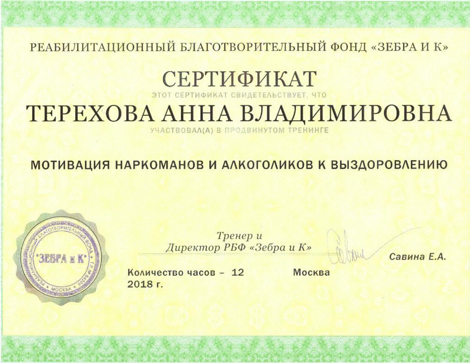 Порекомендовала Терехову Анну Владимировну как специалиста, которому можно доверять в сложных и деликатных ситуациях, близкая знакомая. Совместными усилиями смогли сподвигнуть отчима, который категорически не признавал свою проблему, на пребывание в реабилитационном центре. Анна Владимировна — высококвалифицированный психолог. Ее присутствие всегда способствовало созданию спокойной и доверительной обстановки. На протяжении всего периода лечения Вы были рядом с нами, спасибо за профессиональную помощь, человеческую поддержку и стабильный результат! Это очень важно, когда ты не один на один со своей бедой.